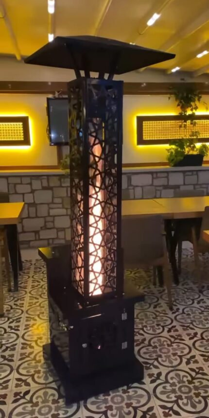 Der Kamin besteht aus einem demontierten Eisenbehälter, Glas und einem Deckel.